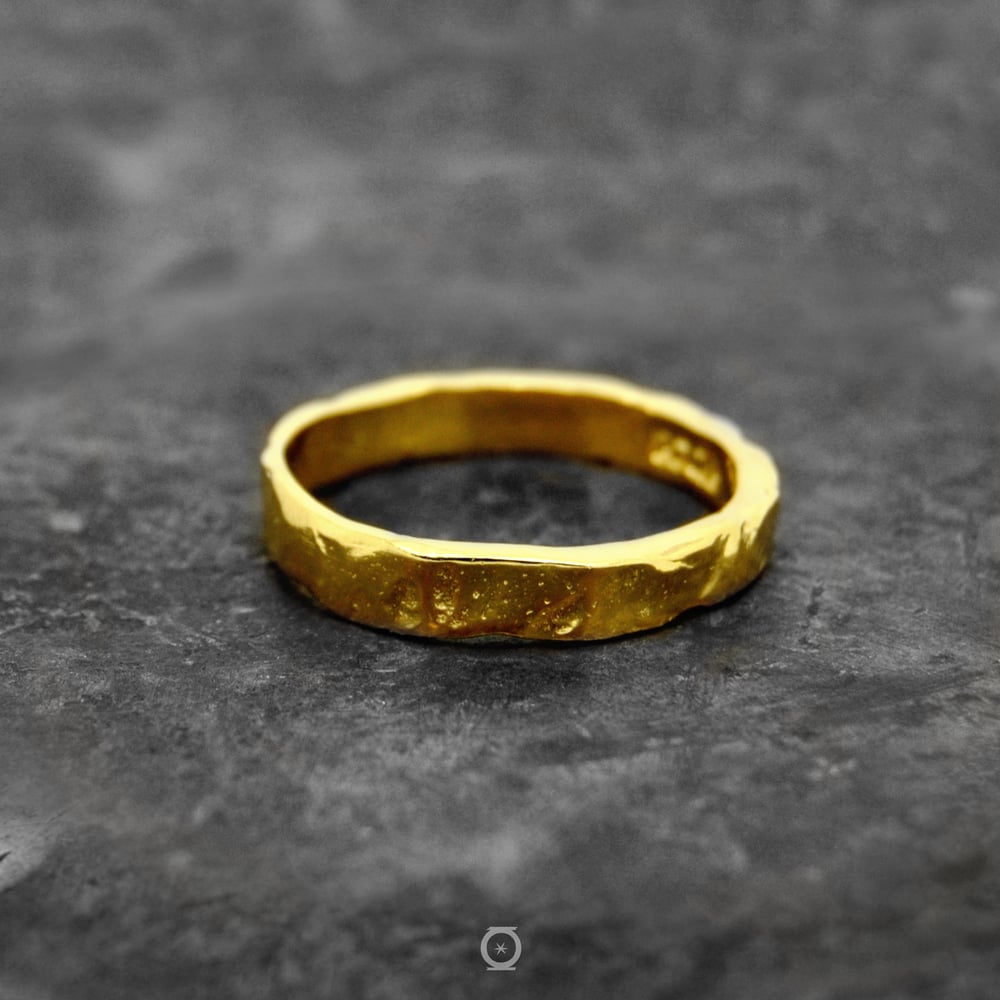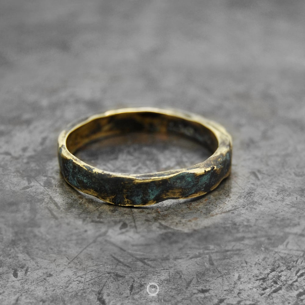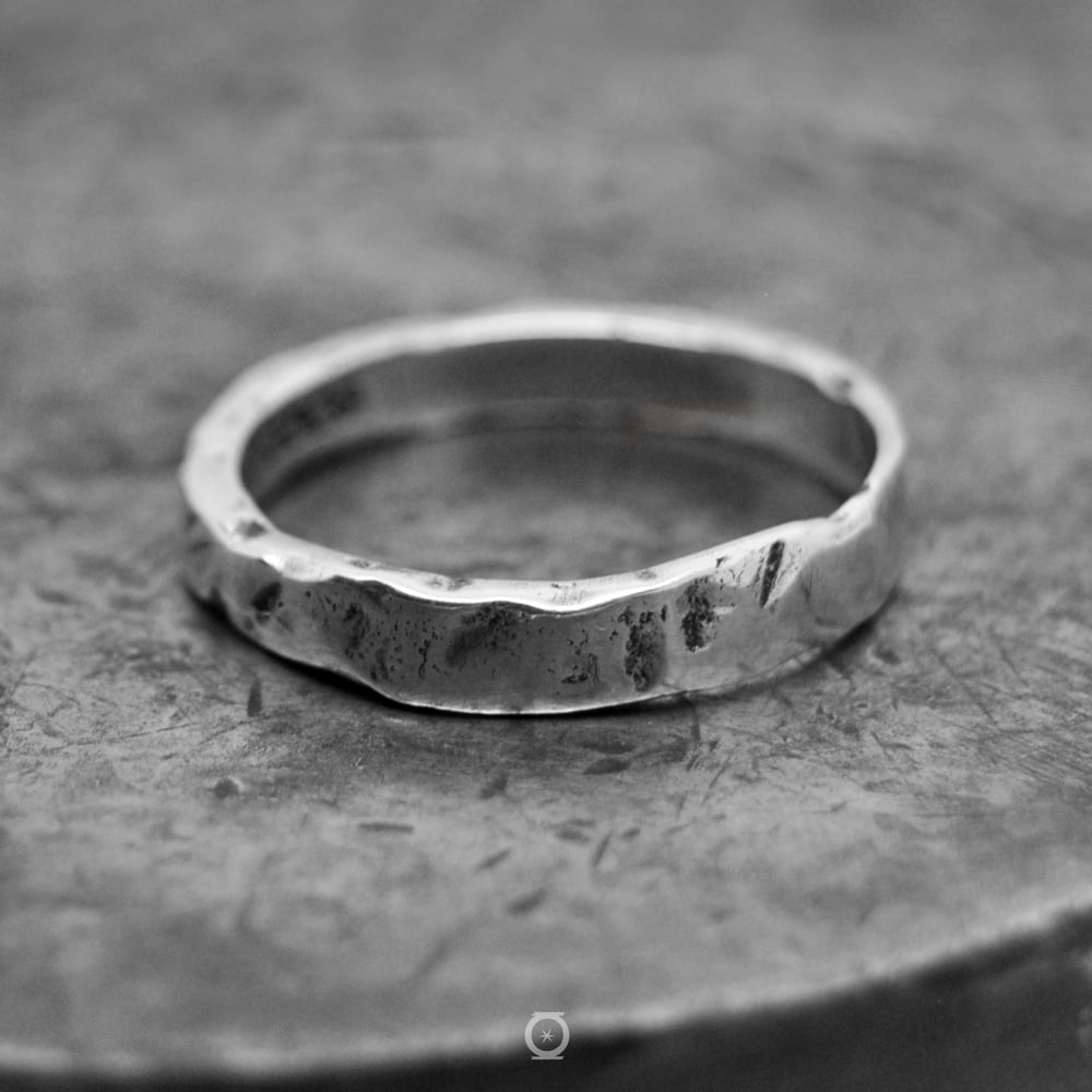 Se trata de un anillo para hombre o mujer tipo alianza, fundido y trabajado a mano para conseguir un look craft del martilleado. Acabado con una pátina de envejecido para un aspecto mas urbano y canalla.