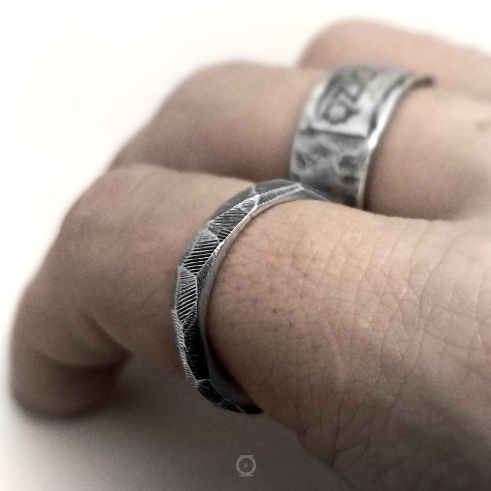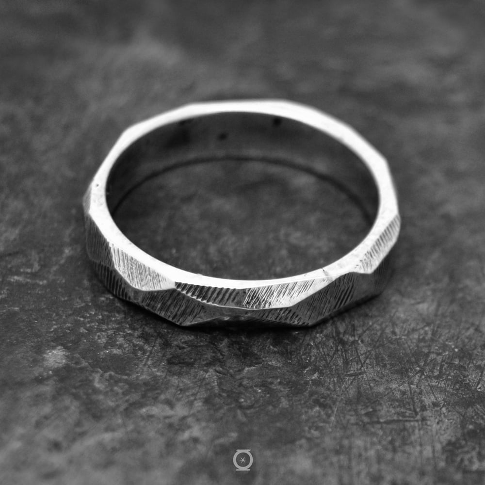 Se trata de un anillo tipo alianza, fabricado a mano en un proceso artesanal, con marcas del limado en sus facetas para conseguir un look más craft. Es la hermana mayor de nuestra alianza 7301, conservando su esencia poligonal pero con mayor presencia en el dedo.