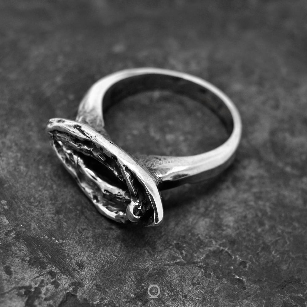 Un pequeña gran vagina portátil, para que nadie te toque el coño. Como todas nuestras piezas, se funde y labra a mano en plata de ley 925 conservando la esencia artesanal y una textura rústica potenciada por el acabado oxidado de la plata.