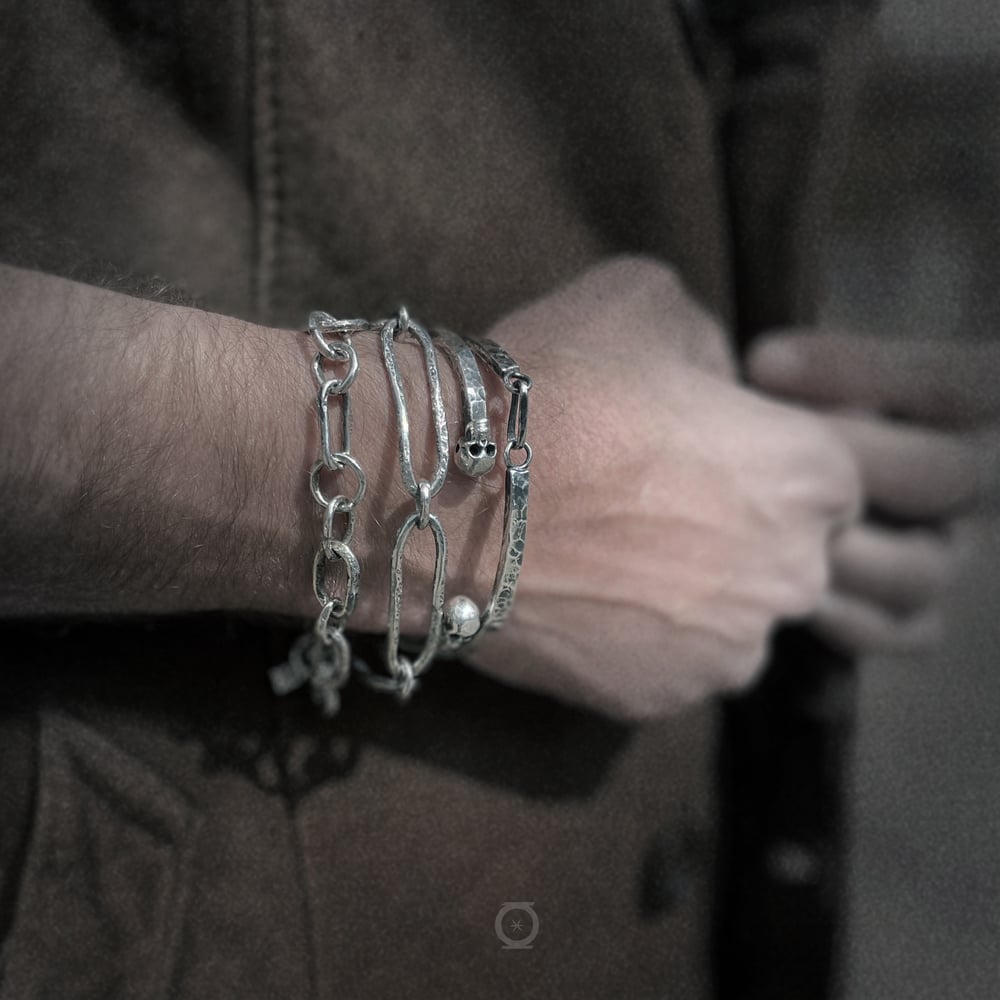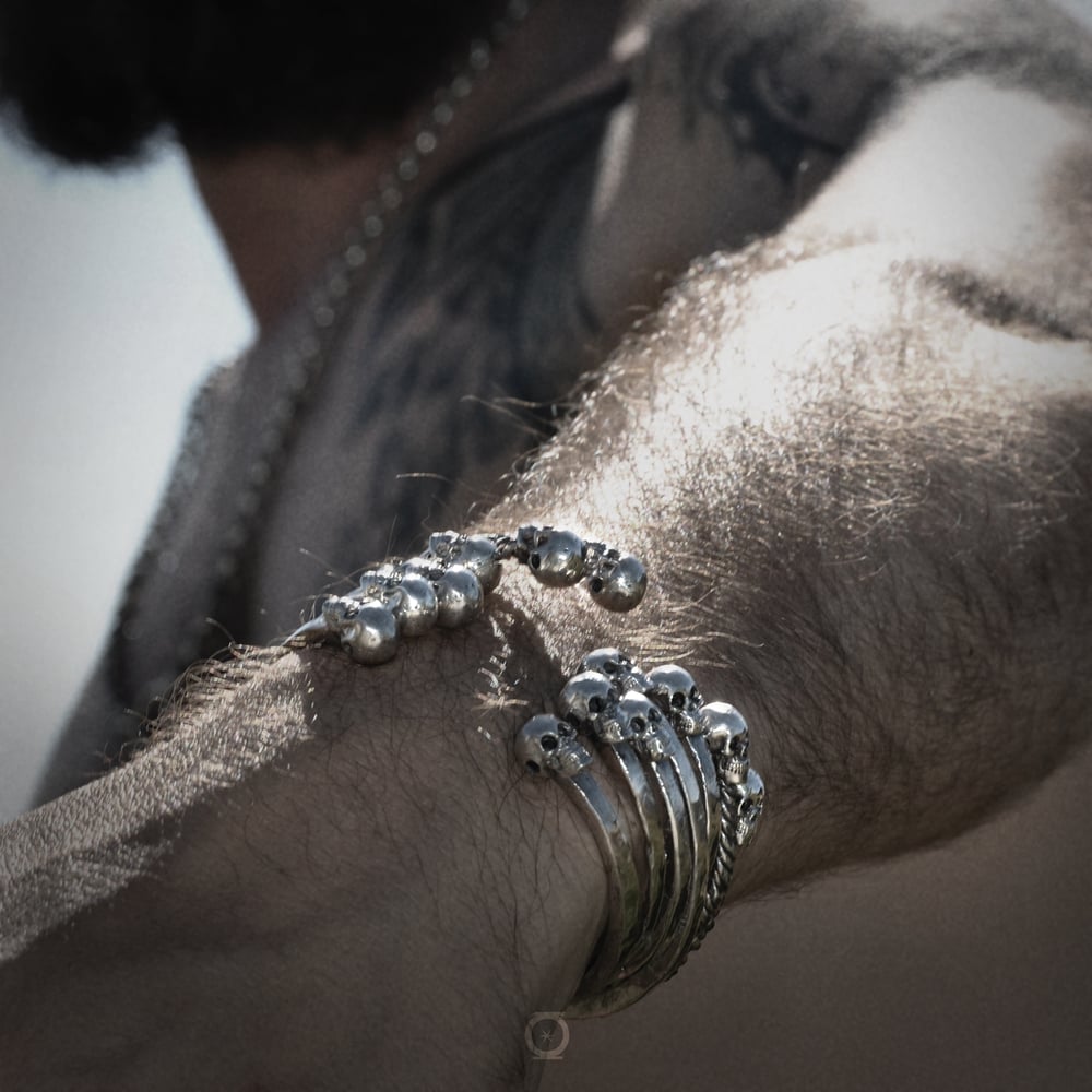 Brazalete de plata de ley martillada con dos calaveras en los extremos.