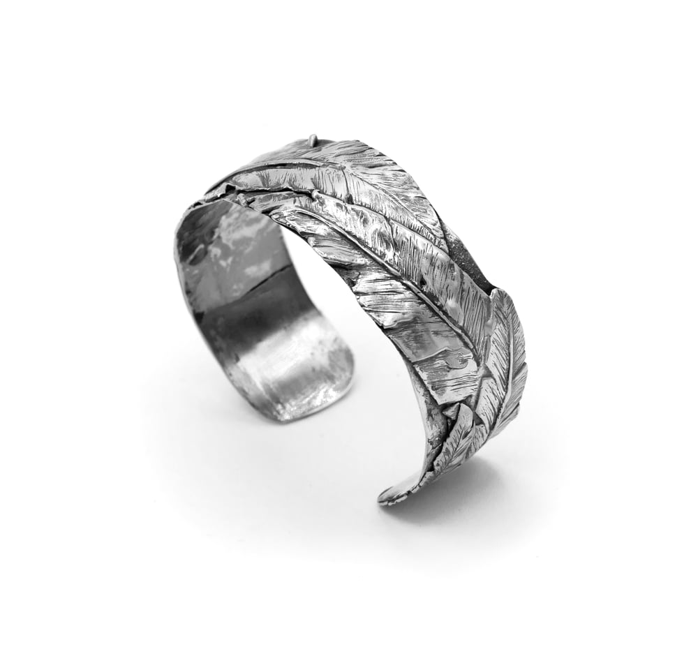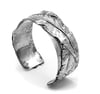 Brazalete único fabricado totalmente a mano con técnica de refundido de planchas de plata y grabado.