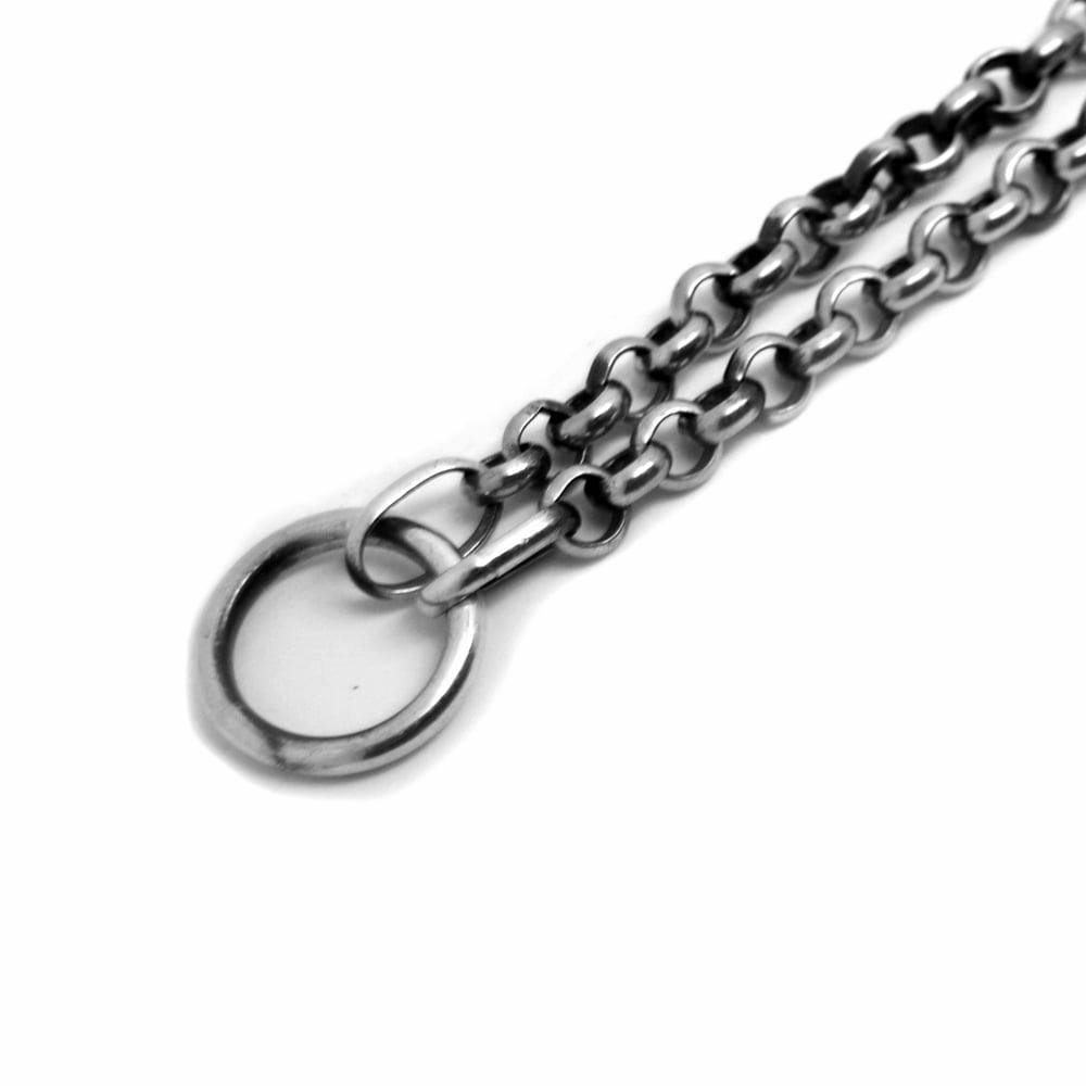 Cadena de plata de ley con eslabones rolo o bauleta. Los modelos de 60cm nos permiten que pueda usarse tanto como cadena como pulsera estaqueada. Ofrecemos también la opción sin cierres, terminarla con una anilla soldada donde poder añadir colgantes.