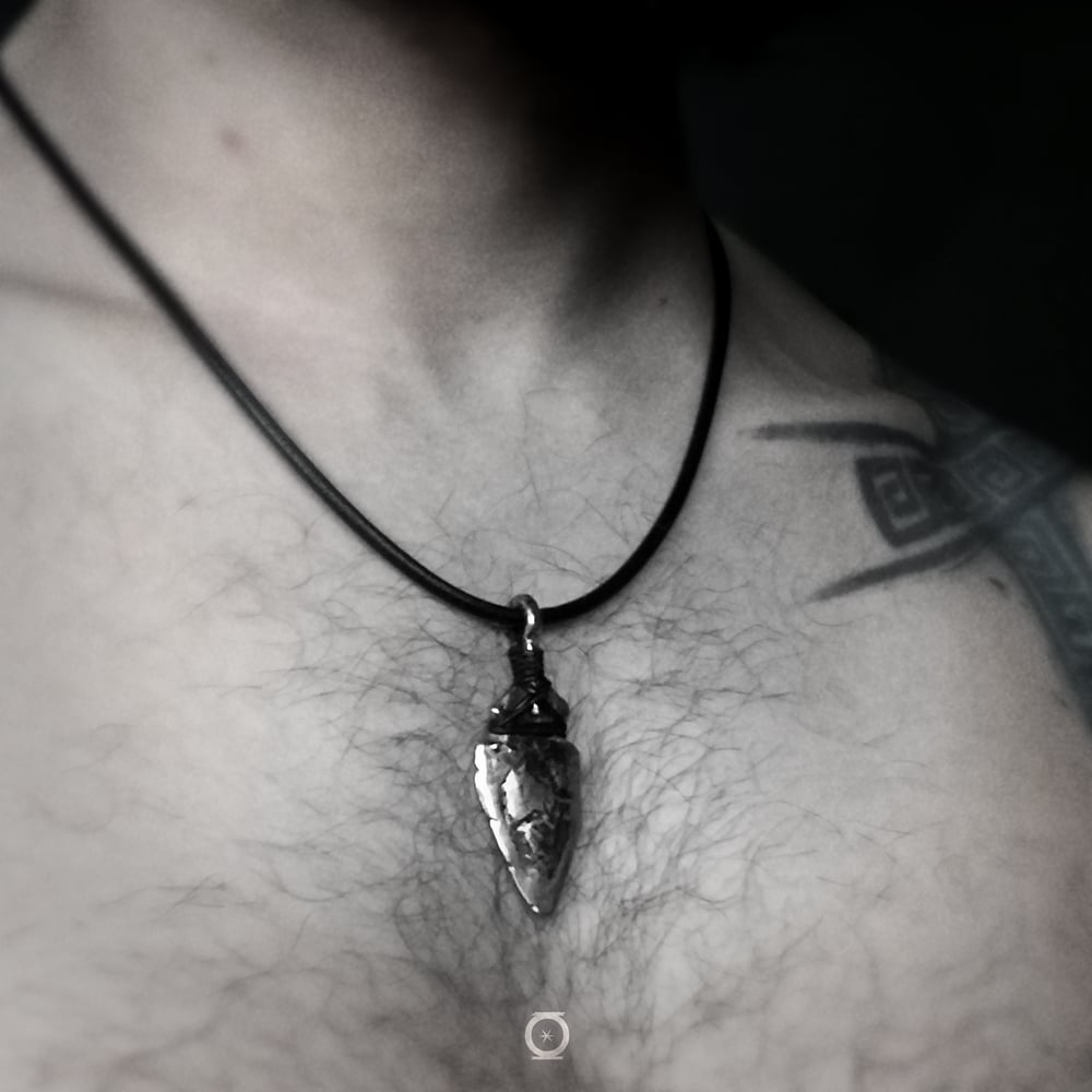 Un colgante de plata de ley simulando una punta de lanza, trabajado y acabado artesanalmente para mantener una esencia prehistorica. También disponible en broncce envejecido.