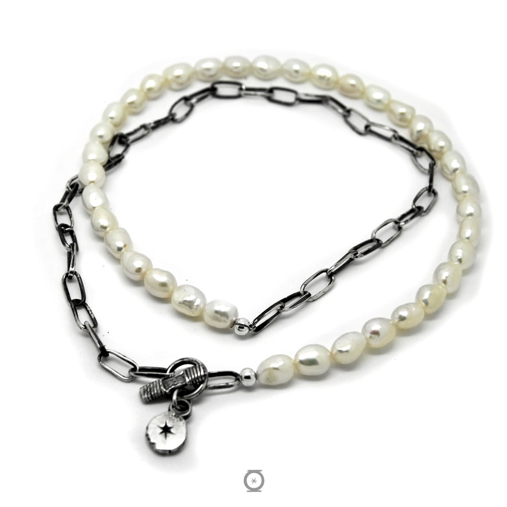 Collar de perlas y eslabón artesano de plata, martillado en plano de 1,5mm de grosor, fabricados y soldados completamente a mano.
