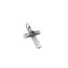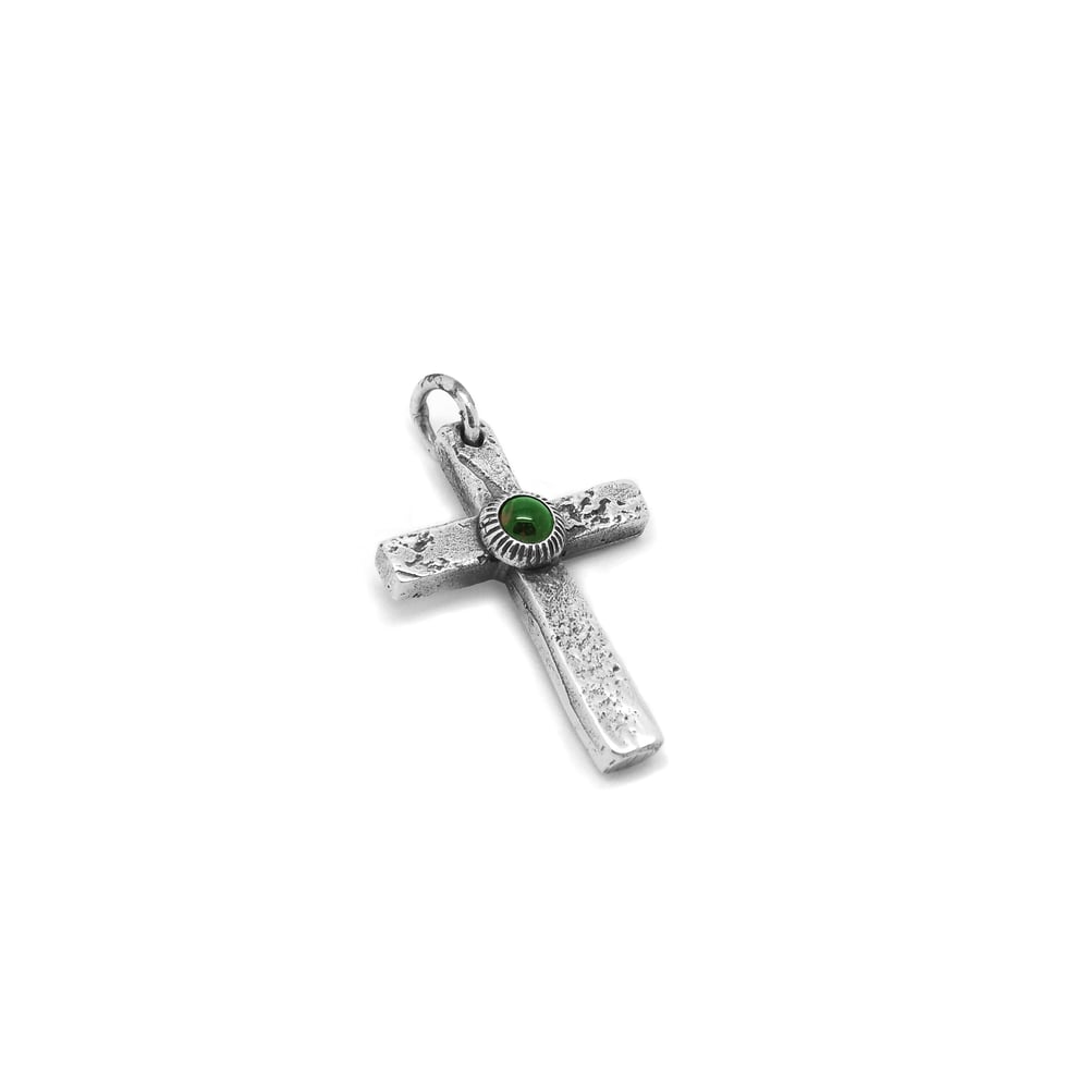Cruz en plata de ley con textura rocosa y envejecida. La fé se trabaja despacito, como la plata, pero no hemos tenido mucho tiempo. Para compensar le ponemos un rubí o una esmeralda reconstituidos. ¡Cada uno lo que se ha ganado!