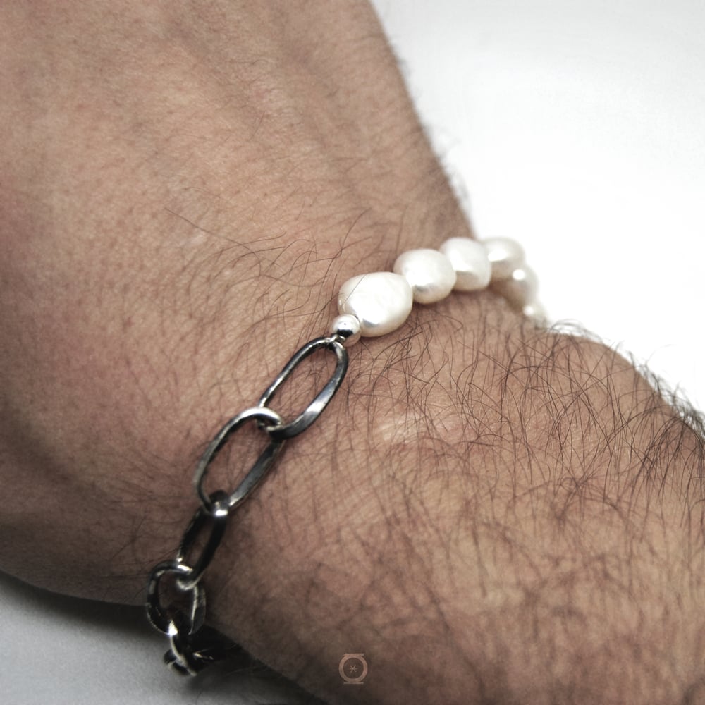 Pulsera de plata de ley con eslabón artesano martillados en hilo de 2mm y perlas naturales. Si la quieres con un cierre tradicional de mosquetón, sólo tienes que pedírnoslo.