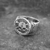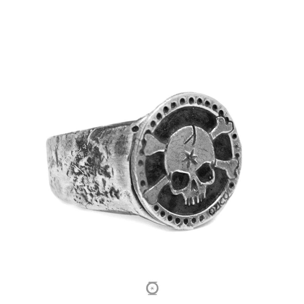Un típico sello de plata, con una típica calavera y típicas tibias cruzadas. El típico anillo de los piratas más piratas.