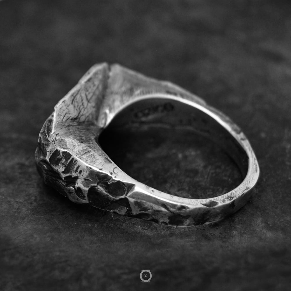 Como todos nuestros anillos, se ha fundido y labrado a mano en plata de ley 925,, envejecida posteriormente para potenciar las rugosidades e imperfecciones de su proceso de fabricación. Logramos así un aspecto mucho mas urbano.